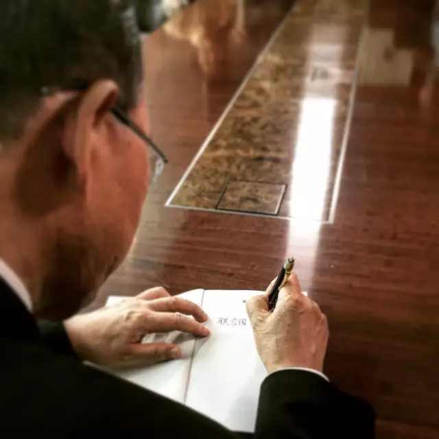 潘基文启程前在刚刚出版《联合国概况》上签名。